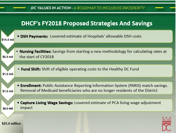 As an alternative to lowering Medicaid and Alliance eligibility levels or reducing the scope of benefits, the Mayor has proposed cuts to DHCF’s budget through actions that: