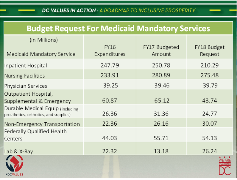It is important to note that for hospital inpatient and outpatient services, the amounts in the Mayor’s budget for FY2018 are significantly less than the amounts budgeted in FY2017.