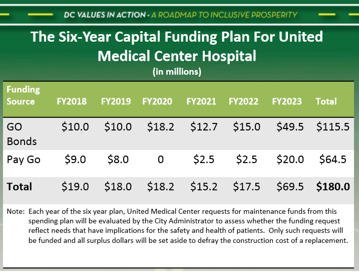 To address both the deferred maintenance needs for the UMC and reserve funds to support the construction of a new hospital, the Mayor has allocated $180 million for these projects in her six-year Capital Budget Plan. As shown below, the allocations for the first five years of the plan range from a low of $15.2 million to a high of $69.5 million. The general goal is to use most of the funds in the early years of the plan to fund those needs which must be addressed to maintain patient health and safety standards.