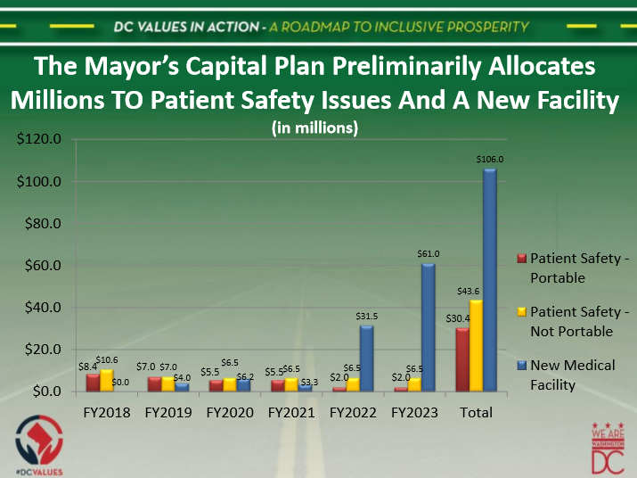 Increasingly, as the end of the six-year period approaches, a greater share of the allocated capital dollars will be set aside to assist with the construction of a new hospital. The graphic shown below outlines this plan, demonstrating the anticipated funding for maintenance projects that are portable to a new facility versus those that cannot be transferred. In FY2018, the entire allocation of $19 million is set aside for pressing needs. However, by the end of the six-year time period, the Mayor is projecting that $106 million will have been made available to defray the cost of a new hospital, with the remainder being spent on both portable patient safety projects ($30.4 million) and the balance ($43.6 million) on similar projects, the future value of which will be lost, unfortunately, when UMC is razed.