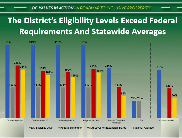 For adults, the differences reported are even more striking. While the District extends eligibility for parents and childless adults to 216 percent and 210 percent of the FPL respectively, the average for other expansion states is 133 percent. Among these states, the highest childless adult eligibility rate is 138 percent of FPL. Further, no individual State provides access to State Plan Medicaid-funded health care to families with incomes that exceed 148 percent of FPL.