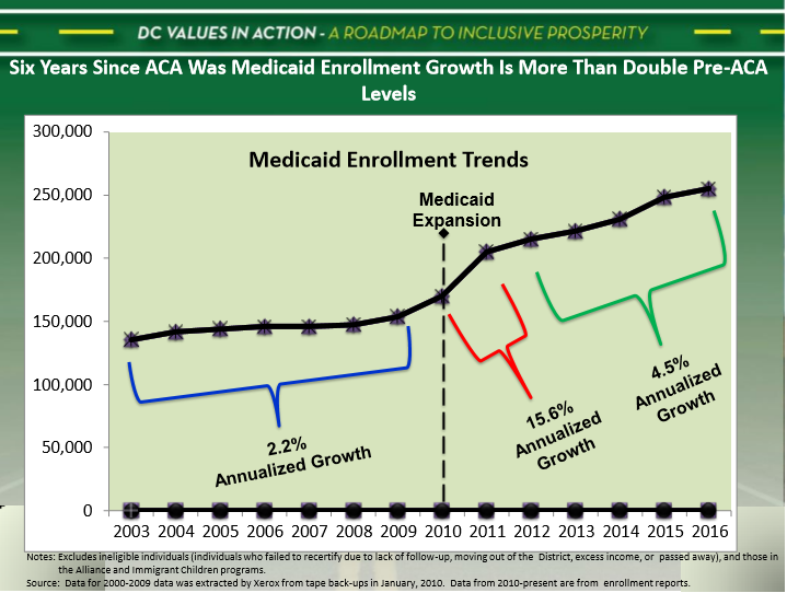 The impact of the District’s more aggressive policies for the Medicaid program can be seen in the enrollment trends for program beneficiaries that quickly spiked following the implementation of expansion policies in 2010. Prior to the adoption of these policies, the enrollment growth in Medicaid averaged 2.2 percent annually (see graphic on page 15).