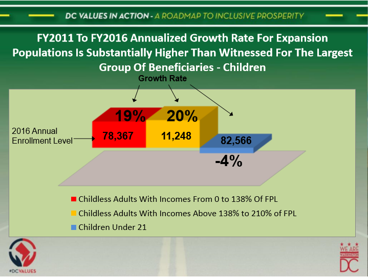 Not only does the District cover the full health insurance cost for this this group, but the city must contend with the rapid rate at which this population is growing. Specifically, in FY2016, 11,248 Medicaid recipients enrolled in the program under this coverage. This represented a 20 percent annualized growth rate from FY2011. By comparison, enrollment growth for children over this same time period was a negative 4 percent, while the rate for the legacy expansion population was 19 percent (see graphic on page 16).