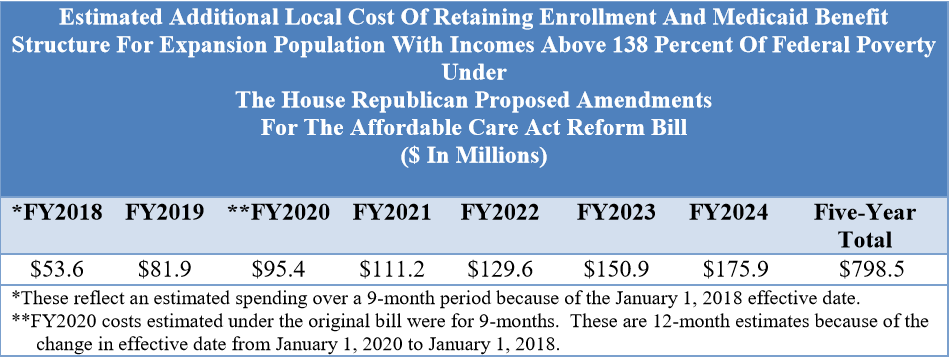 In the District, as noted earlier, we define this population as childless adults with incomes from 138 percent to 210 percent of the federal poverty level (FPL). There are now, roughly 15,000 persons in this category and we updated the estimates to reflect the District’s likely exposure beginning in FY2018 should the House bill pass.